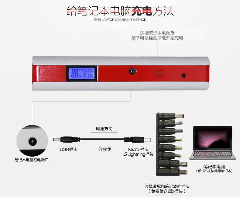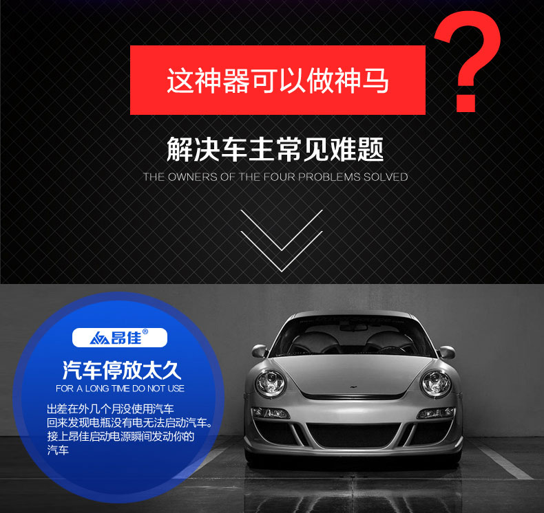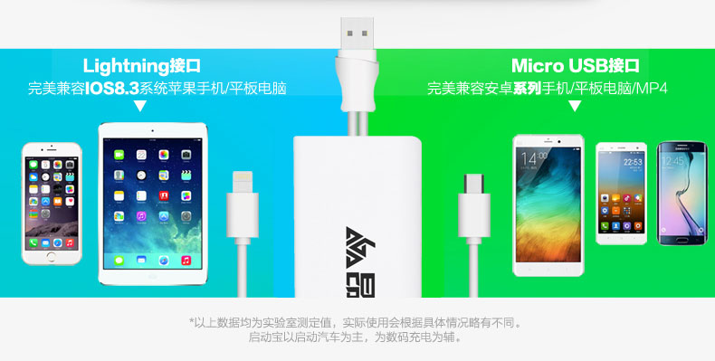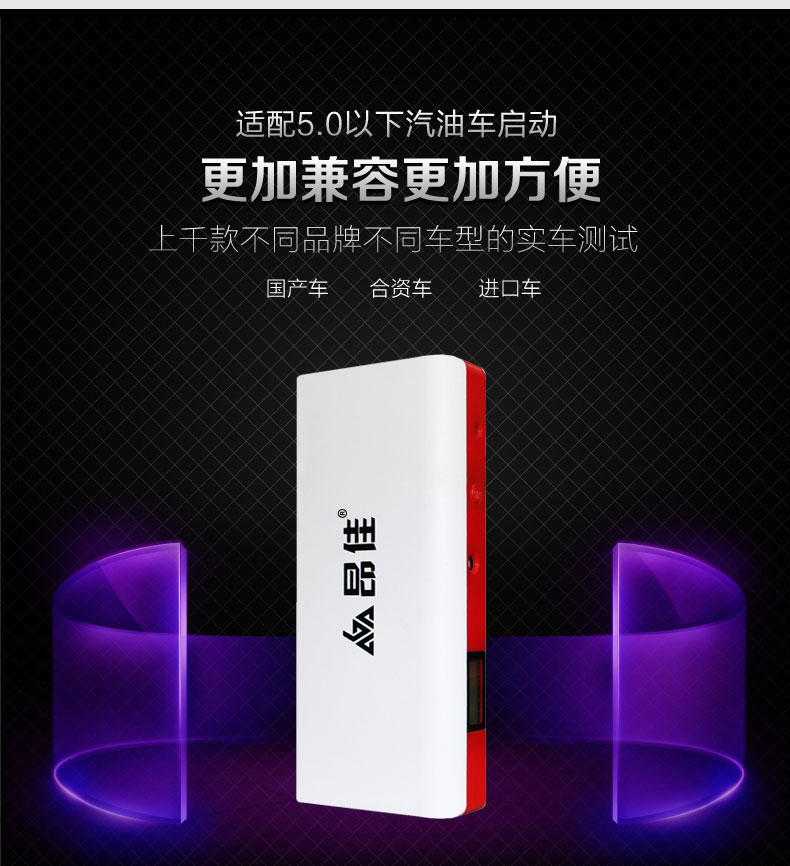 • 主要的功能:汽車應急啟動、LED燈(照明、爆閃、SOS)另可對車載電器、手機、平板電腦、MP4、數碼相機、PDA、掌上游戲機、學習機等產品充電
